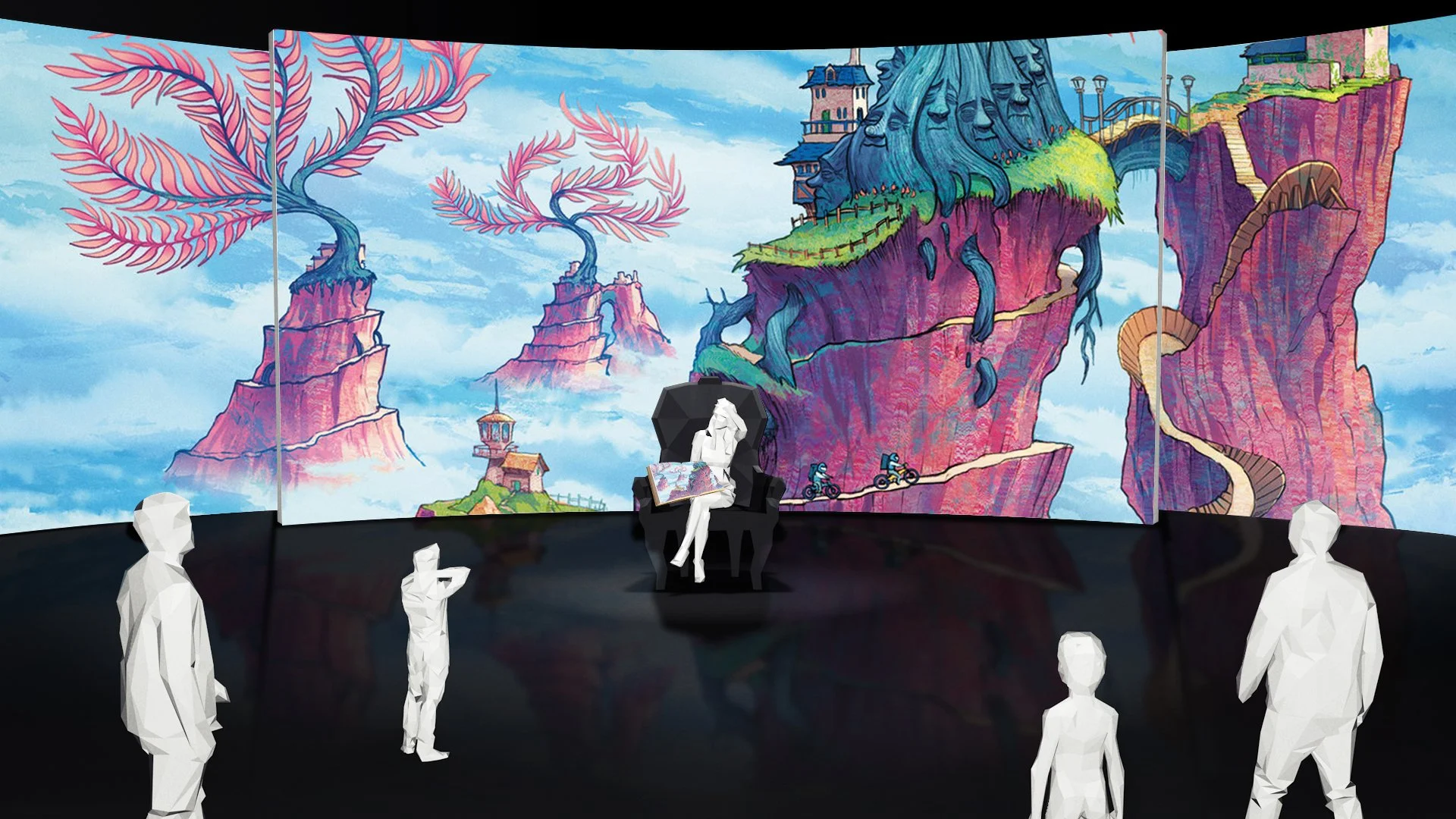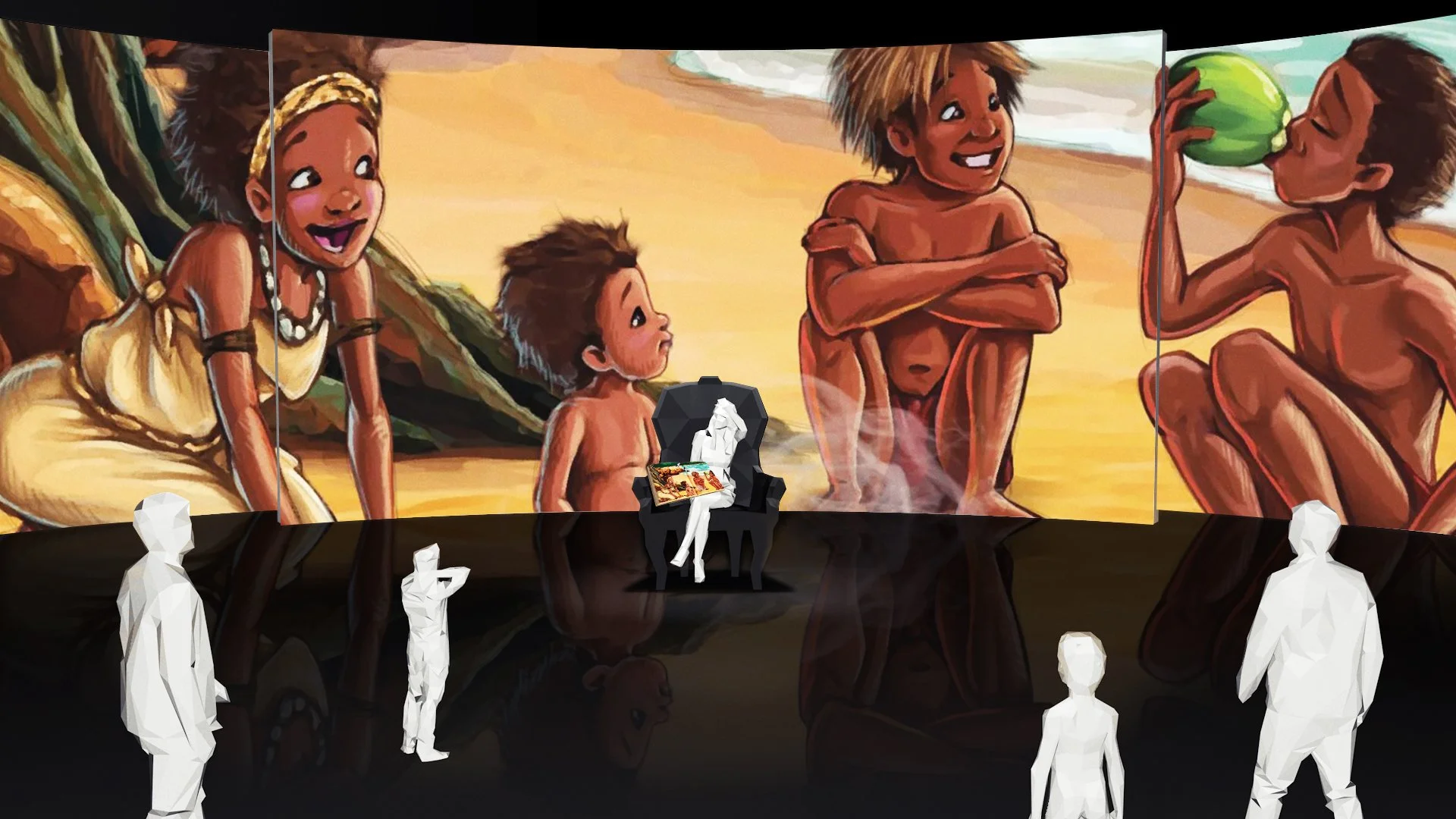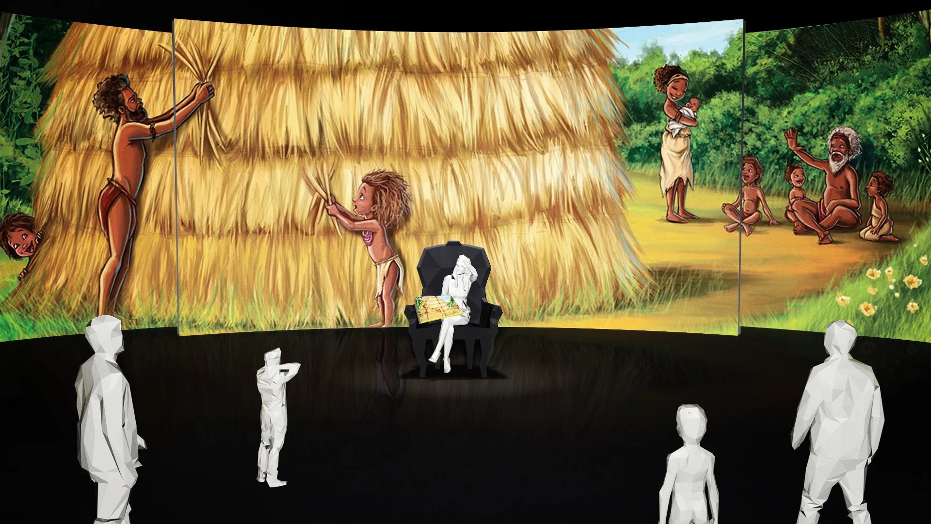 This creative idea aspires to be one of awe and wonder for children, teachers, and the public community, through a narrated interactive projection experience, with sound, light, and even wind. It uses Australian children’s literature and is projected on a series of curved stage walls within public library spaces.
